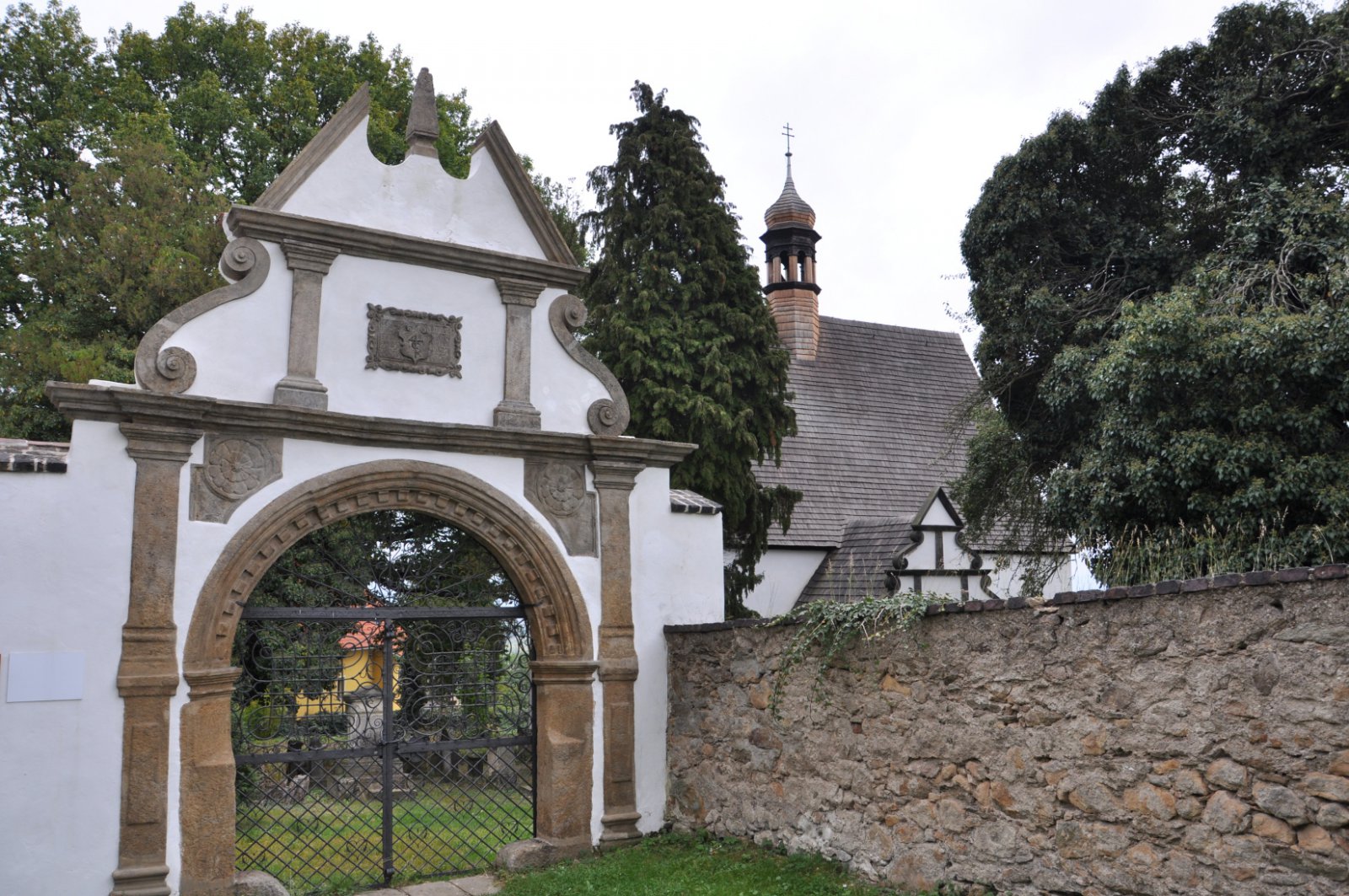 Na hřbitov se vstupuje renesanční branou z roku 1615 postavenou na náklady krupského obchodníka Georga Klippela. Tvoří ji polokruhový vchod s pilastry, které podpírají římsu s vysokým rozeklaným volutovým štítem. Na sever od kostela roste na hřbitově dub zimní chráněný jako památný strom.